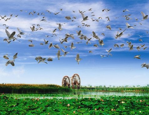 这里湖光戏柳,草树烟绵,百鸟翔集,鱼跃其间,远望水鹭双飞起,近看风荷一向翻。塞上雄浑,江南秀色,豁豁然集于苇浪水波间。湖中有自然植物109种,鸟类97种,其中有国家一级保护动物黑鹳、中华秋沙鸭、白尾海雕、大鸨,国家二级保护动物大天鹅、小天鹅、鸳鸯、鸢等,每逢春夏,成千上万只鸟类在这里栖息繁衍,游人至此,芦丛荡舟,曲径通幽,迷宫观鸟,乐而忘返,一望无垠,如诗如画。