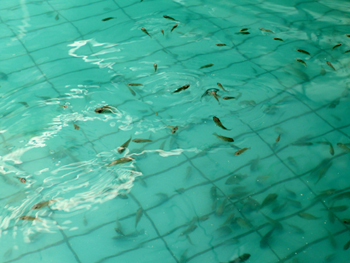 在高温水池中有一种体长不到2厘米的小鱼,据说这种小鱼能在水温高达 43 摄氏度的水里畅游,最奇特的是其奇特的理疗原理和功效, 当人体进入水池中,小鱼都围拢在人体周围,勤勤恳恳(亲亲啃啃)地“工作”,啄食人体老化皮质、细菌和毛孔排泄物,从而达到让人体 毛孔畅通,排出体内垃圾和毒素的作用;同时还能更好地帮助人体吸收水中的多种矿物质,加速人体新陈代谢,达到美容养颜、延年益寿 的神奇功效。当小鱼吸啄皮肤时,开始时会感到有点痒,而随后是一种极为惬意的感觉,是一项令人身心愉快的天然皮肤保健护理。