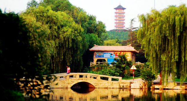 山水园林区:山环水绕、碧波荡漾:桥亭廊榭、错落有致;茂林修竹、翠绿欲滴。